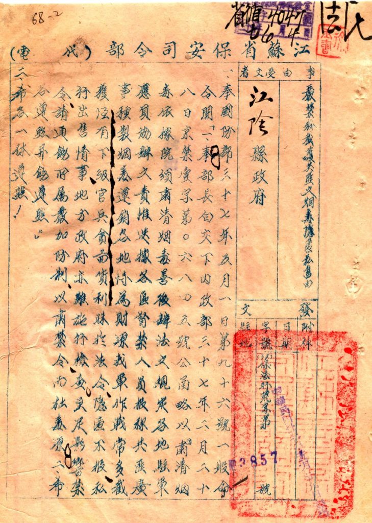 一、奉国防部三十七年五月一日第九十六号一般命令开“一、奉国防部长白崇禧交代下发的内政部三十七年二月二十八日京禁壹字第零六八四五号公函所表述内容为:略以‘肃清烟毒。依据院颁肃清烟毒善后办法之规定,各地驻军应负协办之则。惟迭据各区督禁人员报称,共匪广事种制烟毒,运销各地,恃为财源。我军作战常多截获,恒有下级官兵贪图货利,昧于法令,隐匿不报,私行出售,地方政府亦难实行检查,至足影响禁令。‘请通饬所属严加防制,以肃禁令,而杜毒源。二、希各遵照并饬遵照“